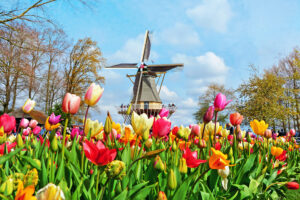 2. Dutch windmill and colorful tulips in spring garden of flowers K